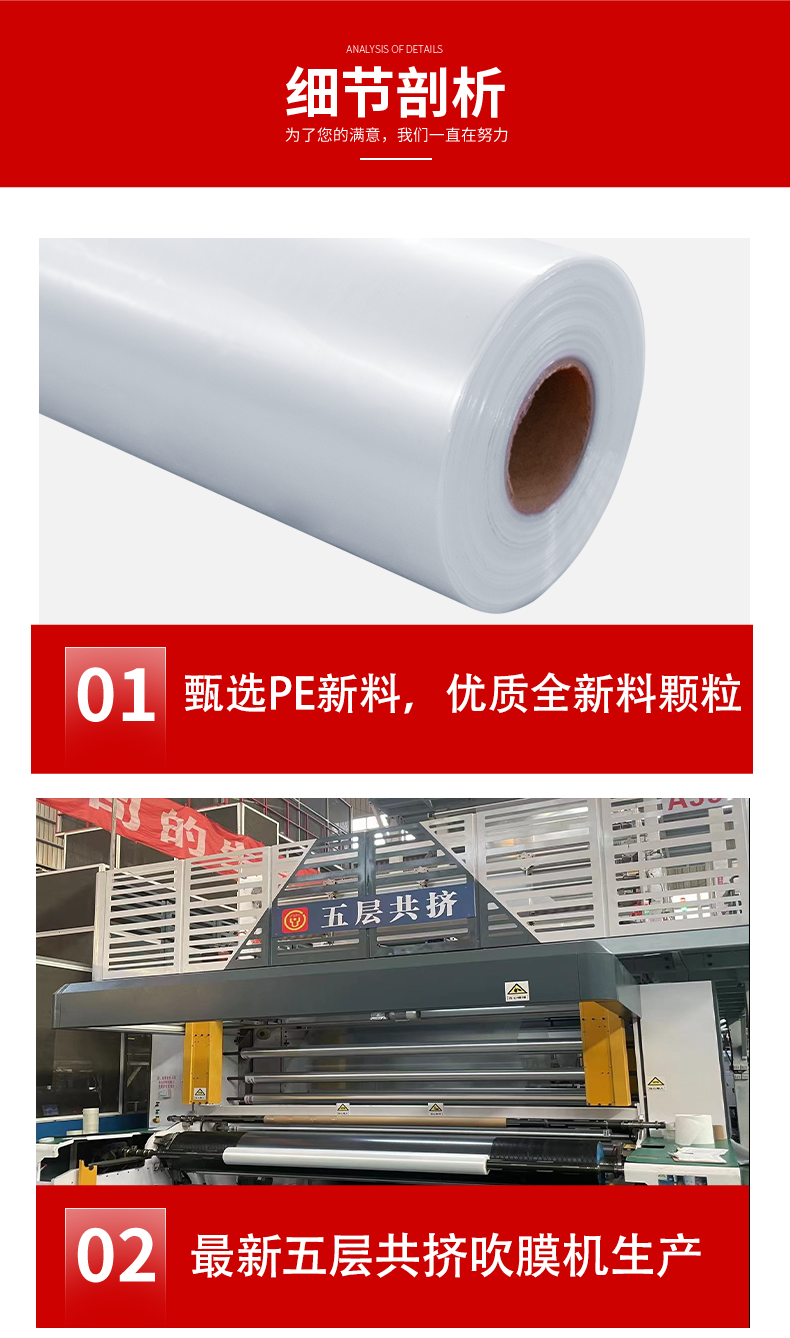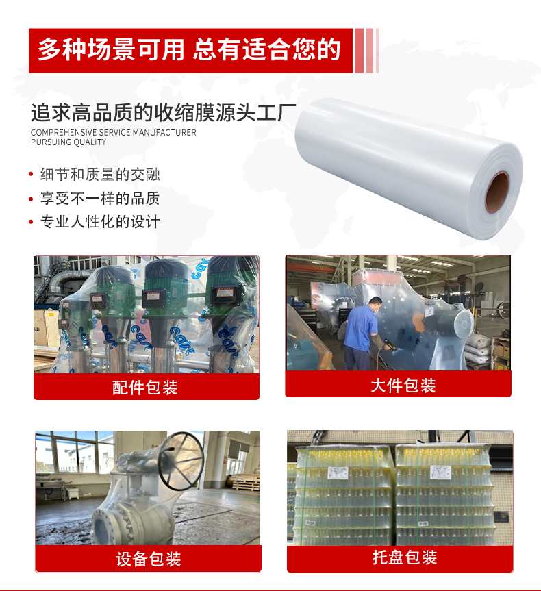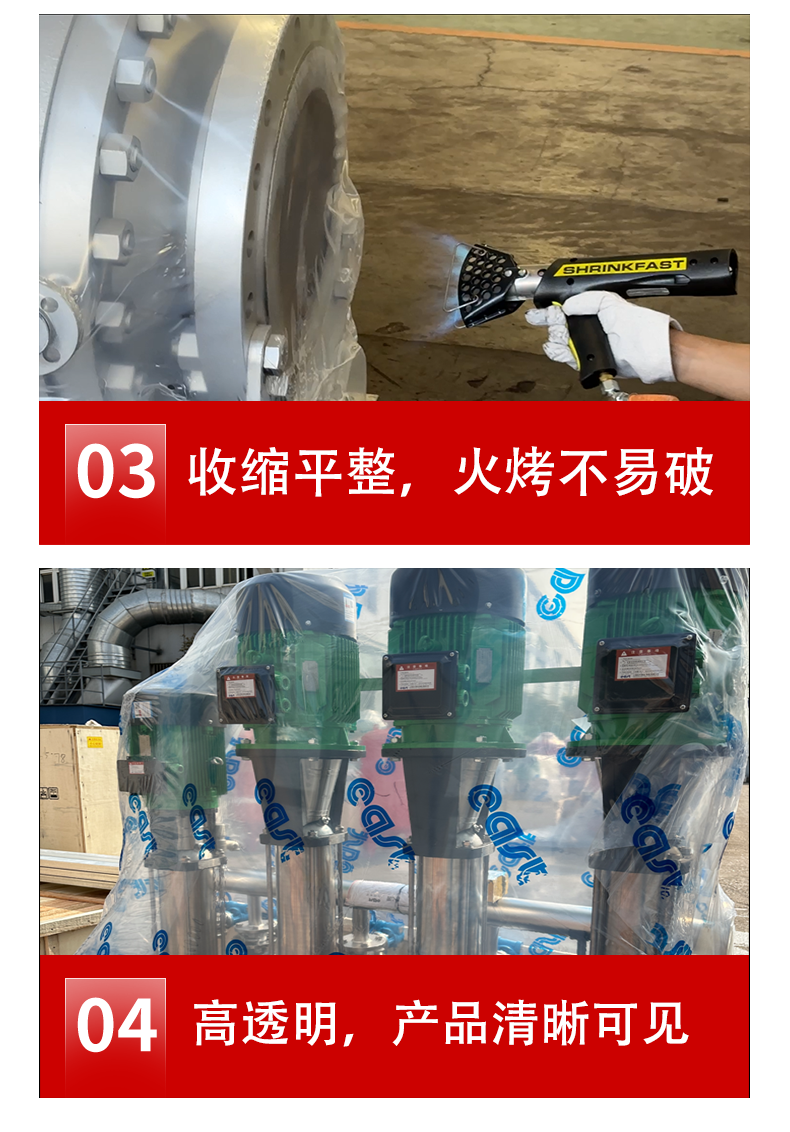 ● 本品采用独特热缩膜配方最新五层共挤吹膜机生产,收缩率高、韧性好,不易老化。 ● 意大利在线测厚和宽控系统,全流程自动化控制,确保产品质量持续稳定。 ● 可配合瓦斯枪或电热封枪加热收缩,不易烤破。 ● 宽度展开可达12米,厚度可达0.3mm。 ● 可应用于托盘、游艇、机械设备、风电等大型物品的热缩包装。
